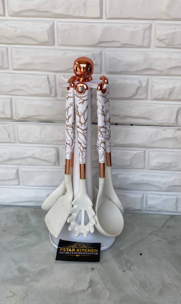 This 7-piece silicone utensil set typically includes a variety of essential kitchen tools made from heat-resistant silicone, designed for use with nonstick cookware. These sets often include items like a spatula, slotted turner, ladle, slotted spoon, and a solid spoon, offering a comprehensive range of tools for various cooking tasks.